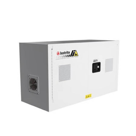 The Justrite Lithium-Ion Battery Charging Cabinet is designed for safely charging and temporarily storing lithium-ion batteries in the workplace. It supports up to 4 kWh TECR total capacity and includes an internal 8‑receptacle power strip for charging multiple batteries at once. A heat‑reactive label on the exterior changes color at 120°F to indicate rising temperatures, and the fixed internal shelf can hold up to 65 pounds. The cabinet measures 24 inches high, 43 inches wide, and 18 inches deep.